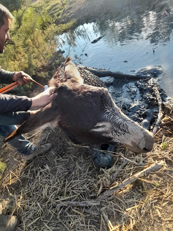 «Esta mañana de ruta por el campo nos hemos encontrado este animal, casi muerto, enterrado ahí en el barro, le enganchamos una cincha hasta ponerlo fuera del barro», relata Diego Castro, uno de los jóvenes, en redes sociales.