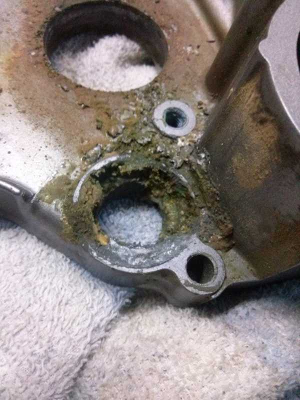 6 Una vez separada de la tapa de embrague, nos fijaremos que en la parte interior de la bomba hay 2 tornillos tipo vis, destornillando estos tornillos lograremos sacar la carcasa y llegar hasta las aspas. Donde alli podremos observar como se encuentra la estopada y como esta el eje.
