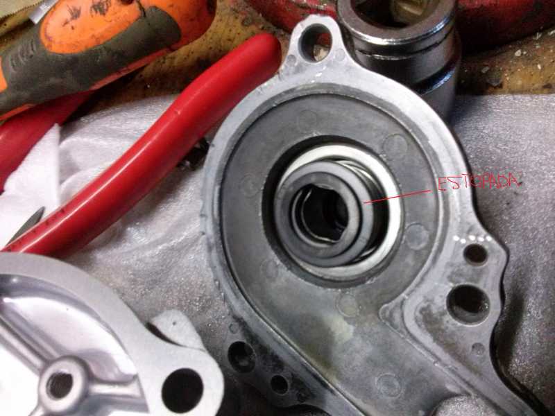 7: procediremos al montaje de las toricas nuevas, y el eje de la bomba con sus retenes, yo en este caso e utilizado una grasa especial que no ataca a las juntas para untar un poco el eje para que vaya fino. A parte que tambien en este caso opte por un poco de pasta o formador de juntas en la carcasa a mas de la torica ya que tambien tenia el problema de que le goteaba por la carcasa.