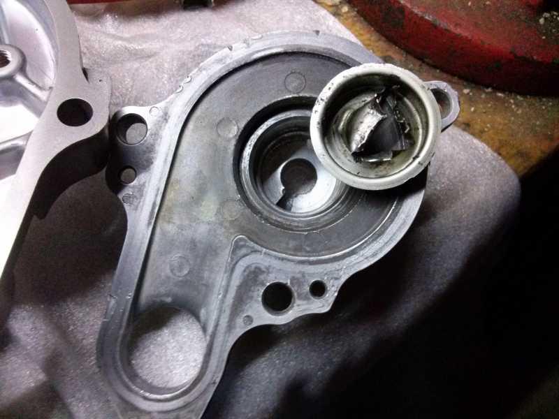 Ahora es momento para desmontar la bomba de agua.Destornillamos los tornillos de la bomba de agua. Quiramos el precinto de la rueda dentada, sacamos la rueda dentada hacia nosotros, sacamos el bulon pasador, y ahora si ya podemos sacar todo el cuerpo de la bomba, que va encajada a presion en la tapa de embrague.