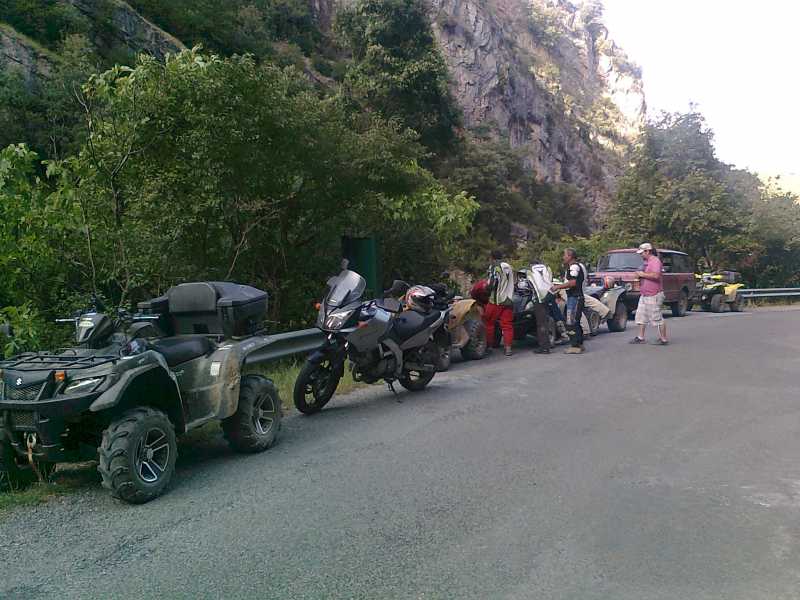 Nos ponemos en ruta, y los pocos km, el primer contratiempo. El quad de David se para y no quiere arrancar, intentamos arreglar la averia sin exito y como ya aprieta el hambre decidimos remolcarlo hasta el restaurante y despues de almorzar ya veremos… .
