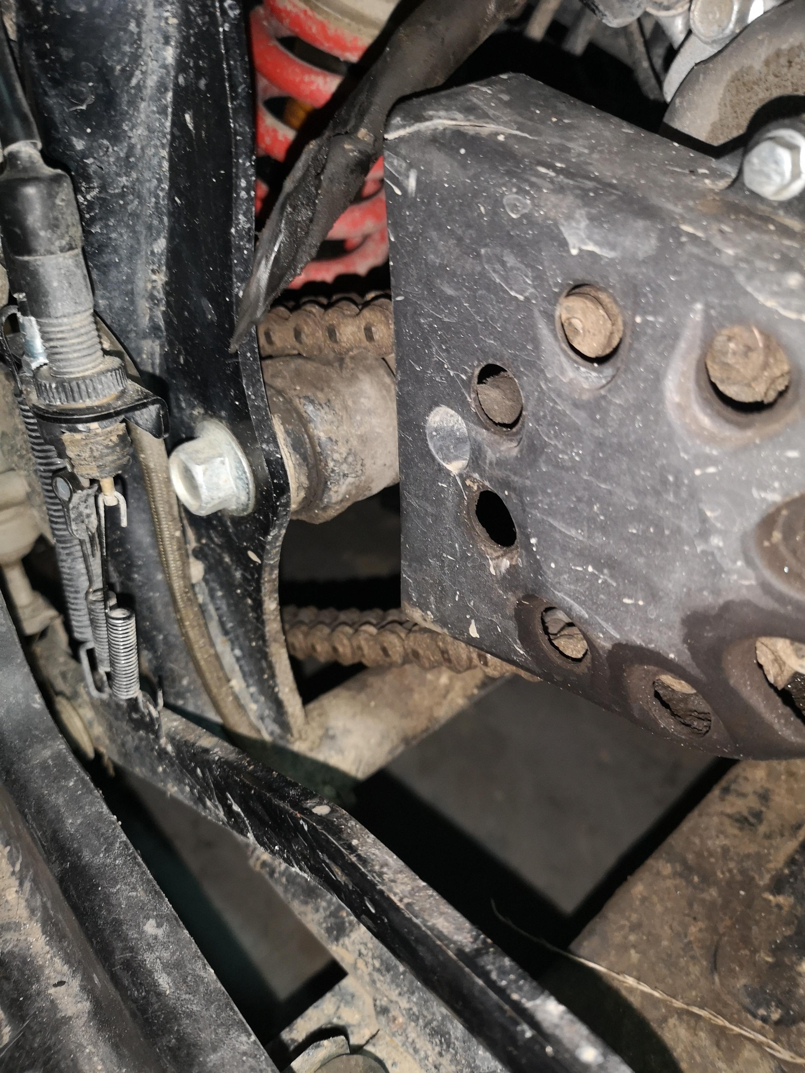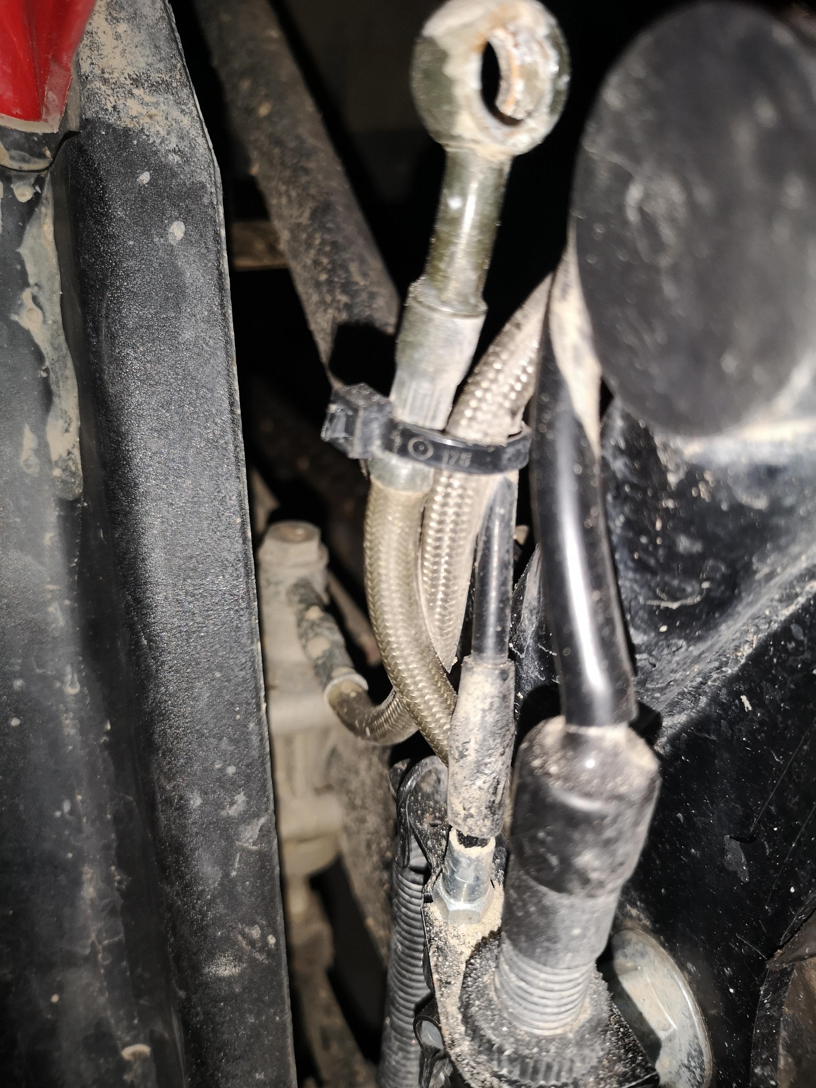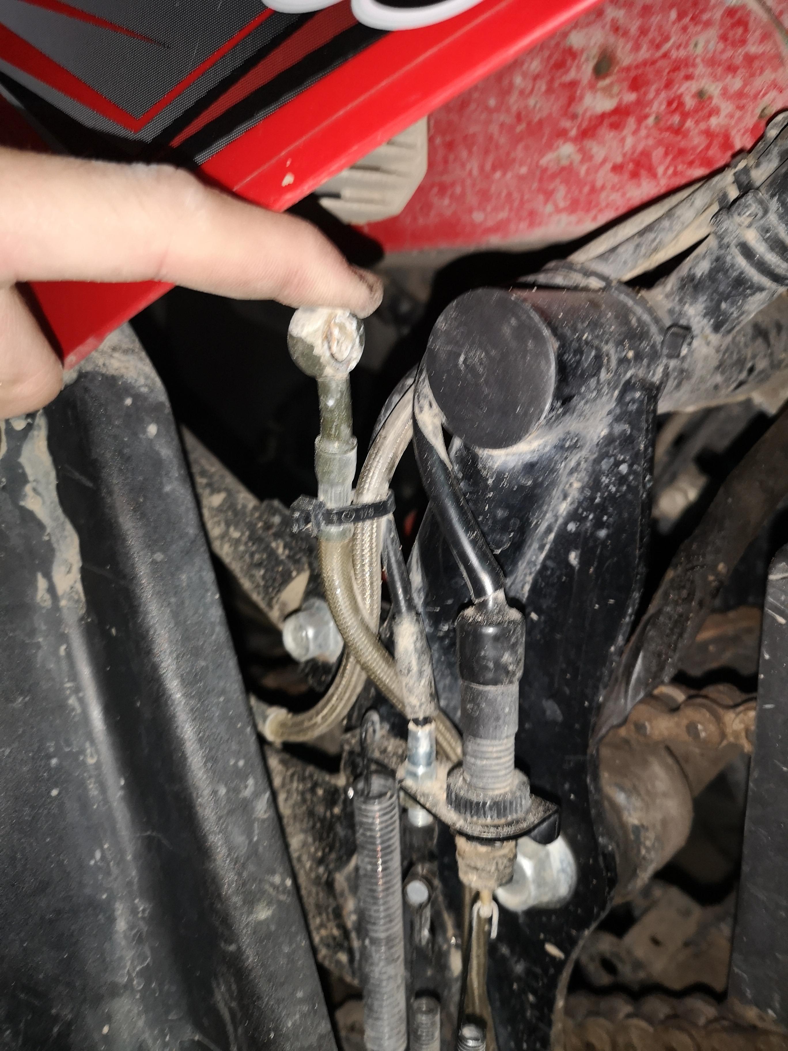 Mirando la cadena veo que un latiguillo va a «ningún sitio». Tenía un trozo de papel higiénico dentro y estaba encintado con cinta aislante, supongo que para que no le entre suciedad. Entiendo que es el del freno trasero porque viene de delante, del mismo sitio donde está enganchado el latiguillo del freno delantero. ¿Cómo y dónde debo ponerlo? Entiendo que hasta ahora no freno nada con el trasero si pulso la manta. Dejo fotos