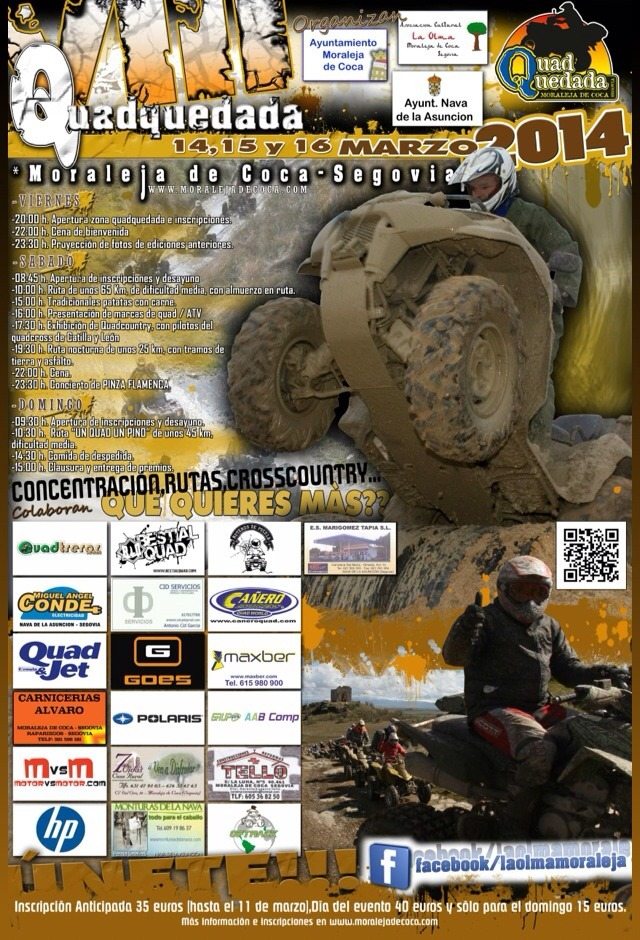 La Asociación La Olma, quiere invitarle a la octava edición de la Quadquedada de Moraleja de Coca que se celebrará el 14, 15 y 16 de Marzo de 2013 en Moraleja de Coca (Segovia). Esta Quadquedada es una jornada de convivencia y reunión de amigos del quad y de la naturaleza...